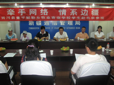 | 新疆通信管理局副局長楊茂發、辦公室主任董艷、新疆互聯網協會副秘書長李培軍、青河縣教育局書記木合亞提出席了歡送會并為孩子送上了真誠的祝福 |