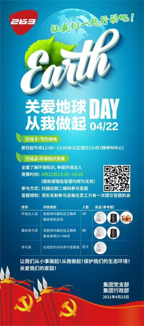 活動(dòng)二 :2021年4月22日,二六三網(wǎng)絡(luò)通信股份有限公司黨支部發(fā)起綠色環(huán)保主題“關(guān)愛地球,從我做起”線上活動(dòng),共有六百多名員工參加了答題活動(dòng),不僅普及了地球環(huán)保知識(shí),也積極宣傳了保護(hù)生態(tài)的綠色發(fā)展理念。