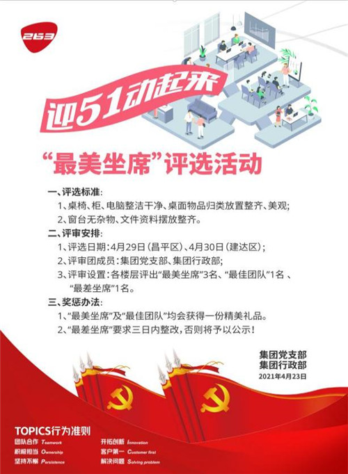 活動(dòng)三:2021年4月23日,二六三網(wǎng)絡(luò)通信股份有限公司黨支部發(fā)起美化辦公環(huán)境,“最美坐席”活動(dòng)。黨員和積極分子作為評(píng)審員和公司職能部門一起對(duì)集團(tuán)及其分公司約600個(gè)席位進(jìn)行評(píng)選活動(dòng),評(píng)選出“最美坐席”和“最佳團(tuán)隊(duì)”,并給予頒獎(jiǎng)。