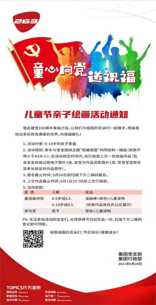 活動(dòng)四:2021年5月24日,二六三網(wǎng)絡(luò)通信股份有限公司黨支部發(fā)起兒童節(jié)親子繪畫“童心向黨送祝福”活動(dòng),孩子們?cè)诠?jié)日里用自己的繪畫向黨獻(xiàn)出了純真的祝福。