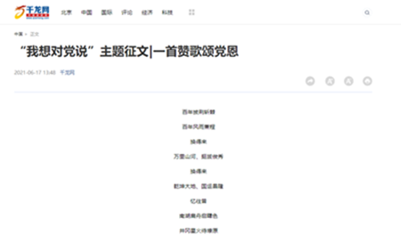 6月23日起,作業(yè)幫黨委開展“我想對黨說”主題征文活動。公司的黨員和群眾積極響應(yīng),踴躍投稿。其中,高中語文教研組李金霞老師創(chuàng)作的《一首贊歌頌黨恩》詩歌,被千龍網(wǎng)錄用發(fā)表。
