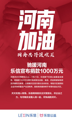 7月21日,在河南防汛救災嚴峻形勢下,樂信公司宣布,旗下樂信公益基金會將通過中華兒慈會、壹基金、深圳市慈善會等社會組織和機構捐款1000萬元人民幣,用于保障受災群眾生命安全,幫助災區居民和企業盡快恢復生產生活秩序。
